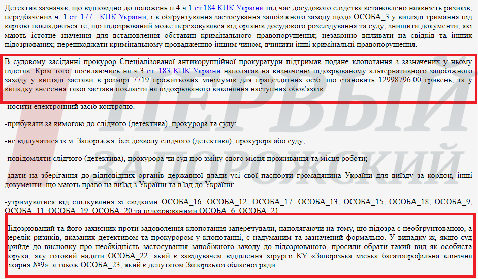 Сам подозреваемый и его защита предложили рассмотреть вариант с личным поручительством. Известно, что поручителем готов был выступить заведующий отделением хирургии девятой горбольницы и один из депутатов Запорожского облсовета.