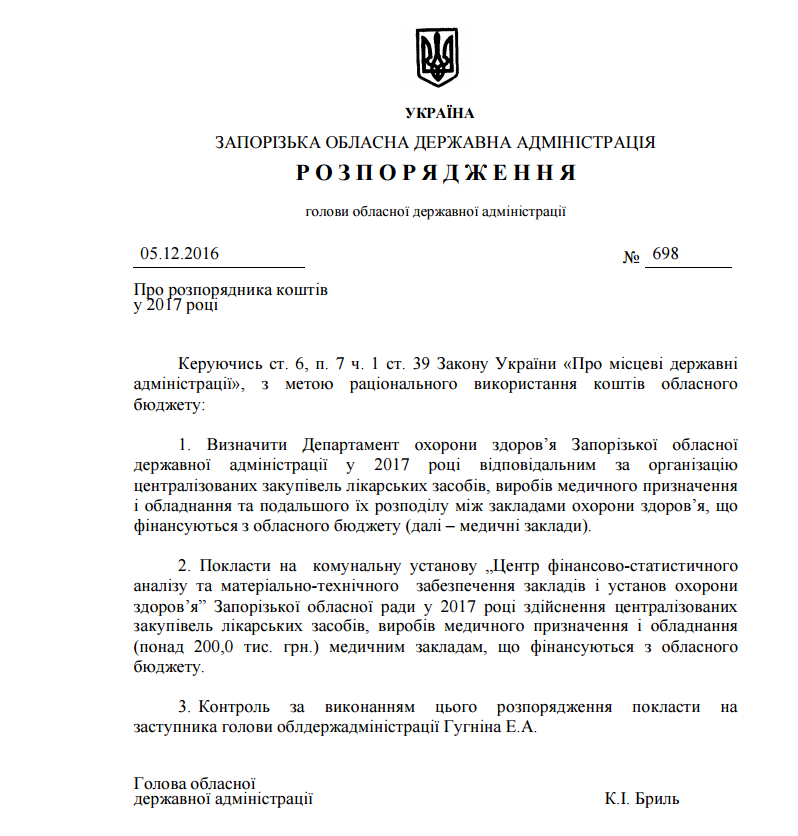 Начиная с 2012 года все лекарства и медпрепараты на область преимущественно закупало КУ «Запорожская областная клиническая больница». Это и препараты для диабетиков, сердечников, гипертонников, гемодиализников и многие другие. Позже медпрепараты поставляли согласно потребностям в городские и районные медучреждения.