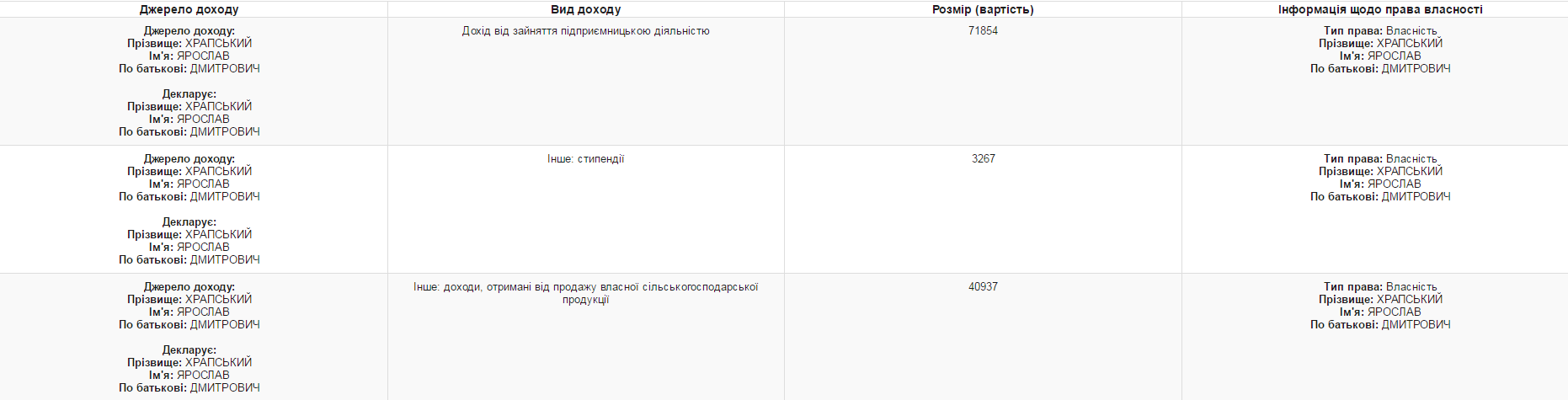 За прошлый год молодой человек получил очень скромный заработок – 116 058 гривен. Из них 71 тысяча гривен – доход от предпринимательской деятельности, 41 тысяча гривен – доход от продажи собственной сельскохозяйственной продукции (неизвестно на каком земельном участке) и 3267 гривен в качестве стипендии.
