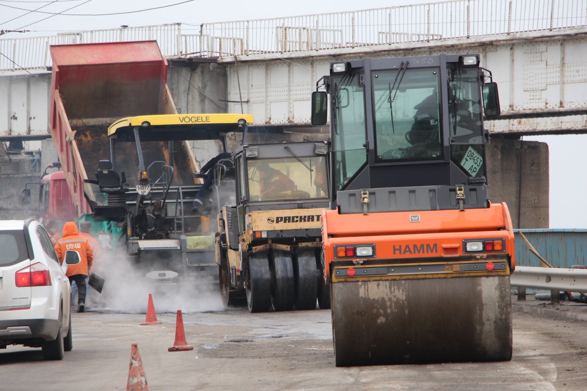 Ремонтные работы на плотине ведутся второй день. Спецтехника и рабочие КП «ЭЛУАД» работают и ночью – фрезеруют поврежденные участки дорожного покрытия, подготавливают к асфальтированию. С 10 утра приступают к укладке асфальтобетона.