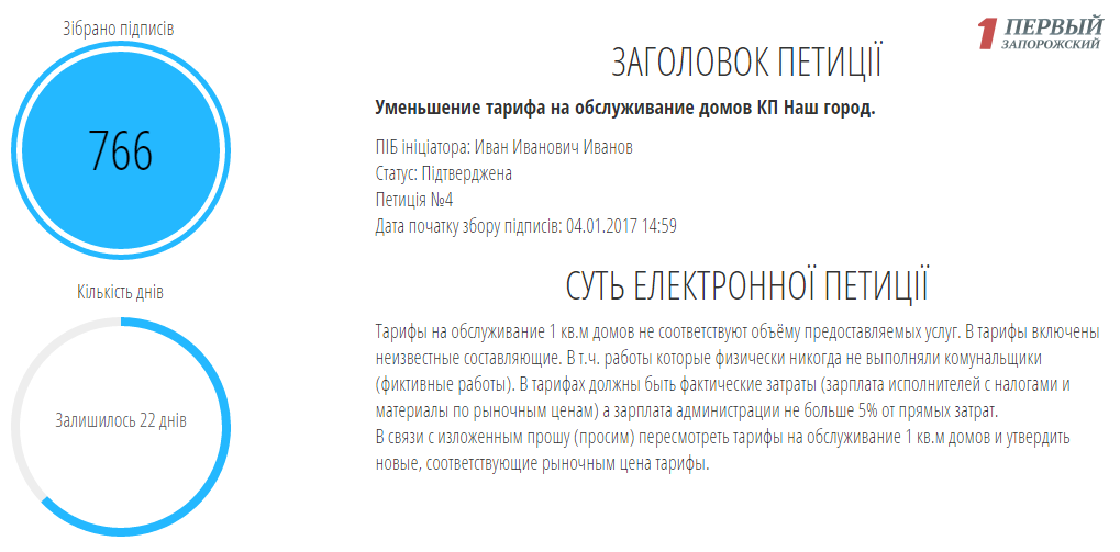 Седьмым обращением, зарегистрированным на сайте запорожской мэрии и набравшим необходимое количество голосов для дальнейшего рассмотрения городской властью стала петиция об уменьшении тарифа на обслуживание домов коммунального предприятия “Наше місто”.