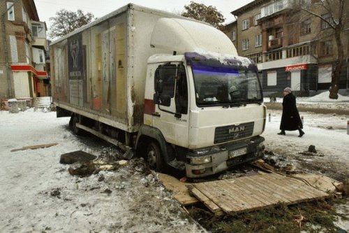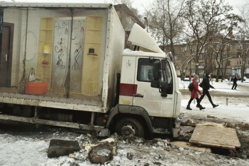 Вчера, 10 января, в Запорожье грузовик MAN провалился передними колесами под землю.