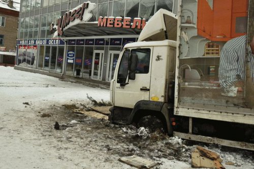 Заметно, что вытащить грузовик из ямы, которая образовалась под его тяжестью прямо посреди тротуара, пытались разными способами, но ничего не помогло, сообщает “Индустриалка”.