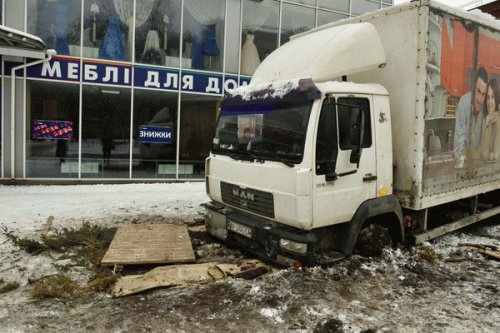 Инцидент произошел на улице Сталеваров в то время, когда водитель грузового авто парковался перед мебельным магазином. Охранник магазина пытался помочь и вызвать трактор, чтобы вытащить габаритный автомобиль.