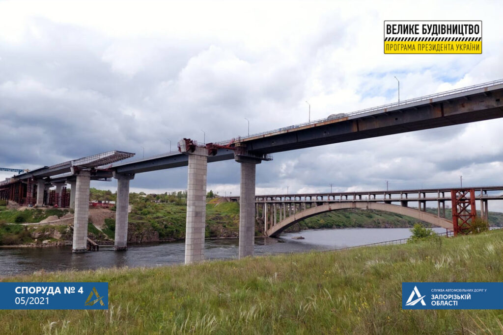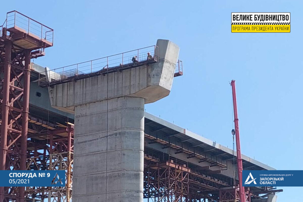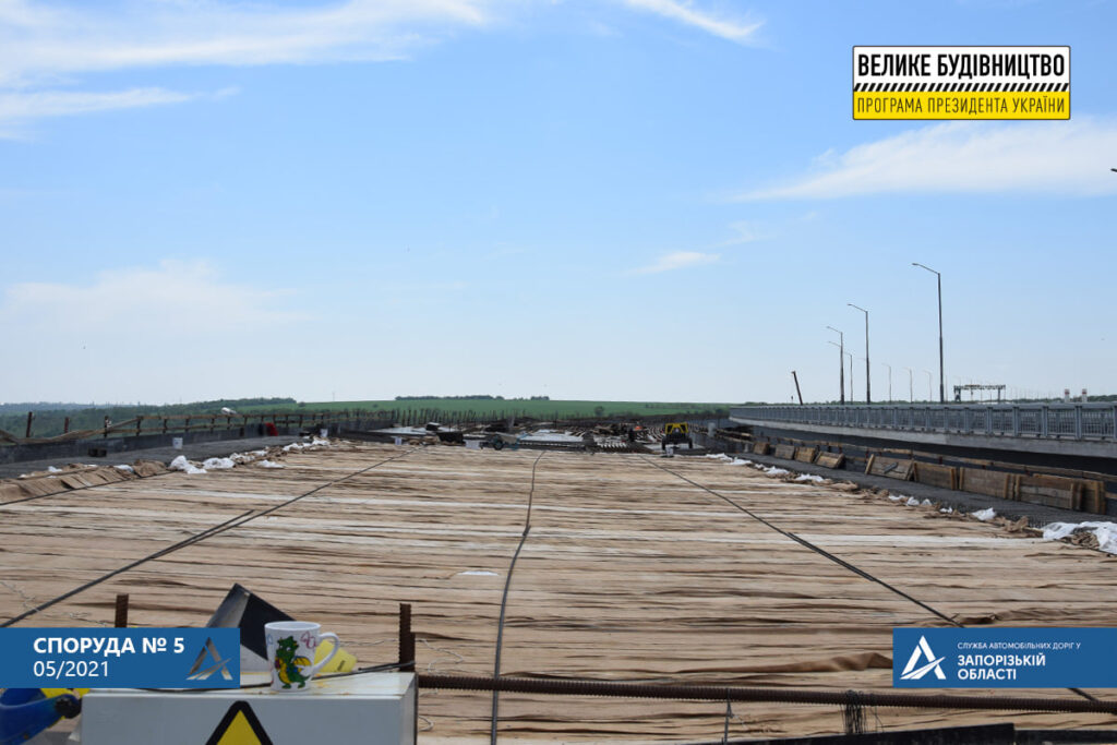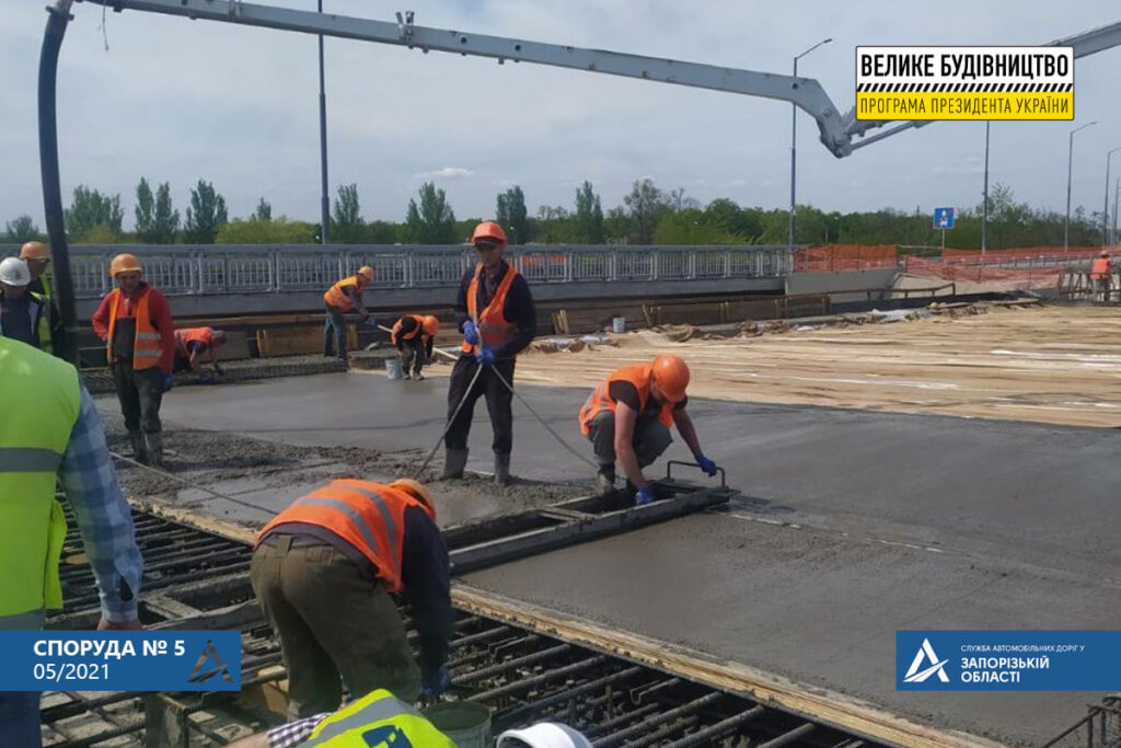 Станом на 18 травня працівники генпідрядної та підрядних організацій завершили бетонування першої захватки для влаштування плити проїзної частини на підході до низової частини балкового мосту з боку острова Хортиця (споруда № 5н). Довжина захватки — 34 метрів, об’єм укладеного бетону – 163 кубометрів.