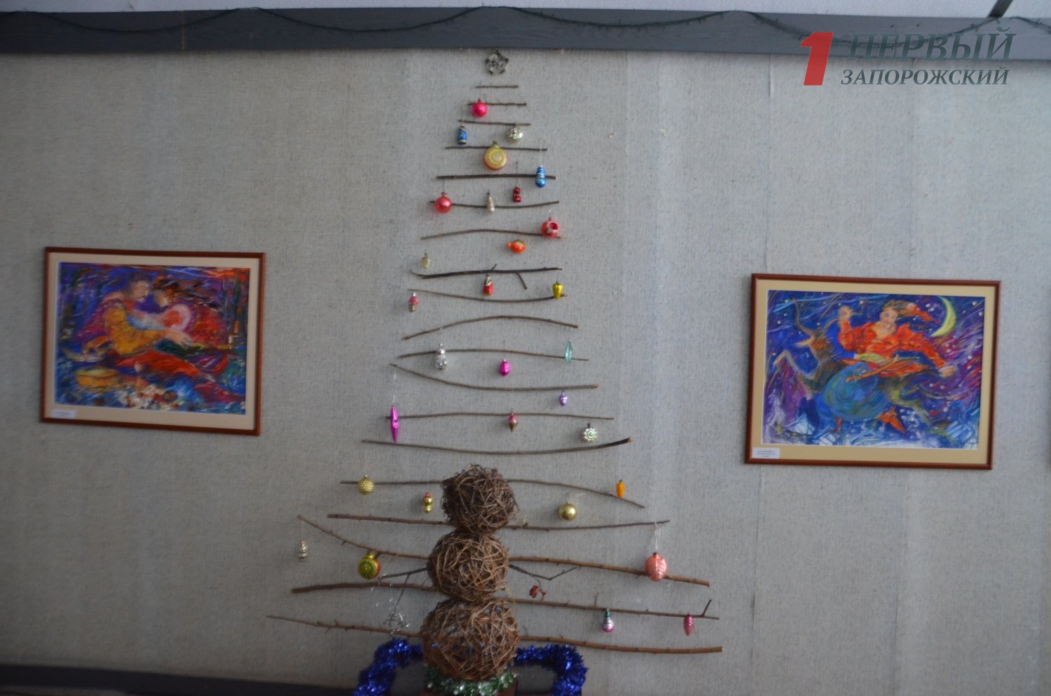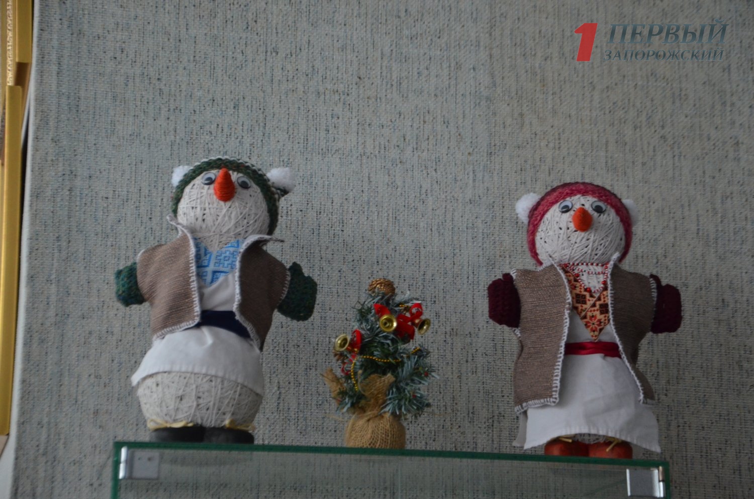 Так, два милых снеговика привезли из Бердянска. Они изготовлены из кукурузных листьев, соломы и травы. Также есть снеговик из виноградной лозы. А дизайн елки из веток придумала председатель Запорожской организации Национального Союза художников Украины Ирина Гресик. Ее украшают игрушки из коллекции самого музея.