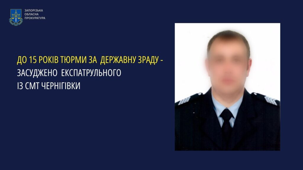 Патрульного з смт Чернігівка, який після повномасштабного вторгнення перейшов на бік ворога, визнано винним у державній зраді та засуджено до 15 років ув’язнення з конфіскацією майна.