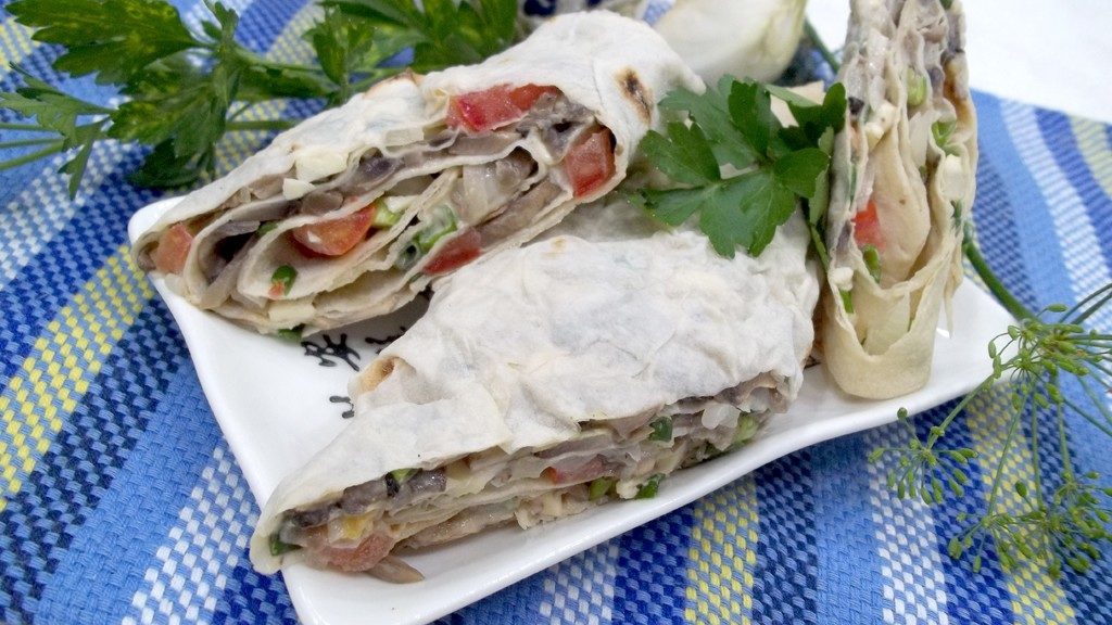 Дуже популярна начинка для лаваша. Ситна й готується просто. Обсмажте печериці з цибулею на пательні. Потім розгорніть лаваш, намажте його майонезом, рівномірно розподіліть по коржу гриби та подрібнені шматочки копченої курки. Потріть твердий сир, згорніть рулет і покладіть його на кілька годин в холодильник. Перед подачею наріжте шматочками.