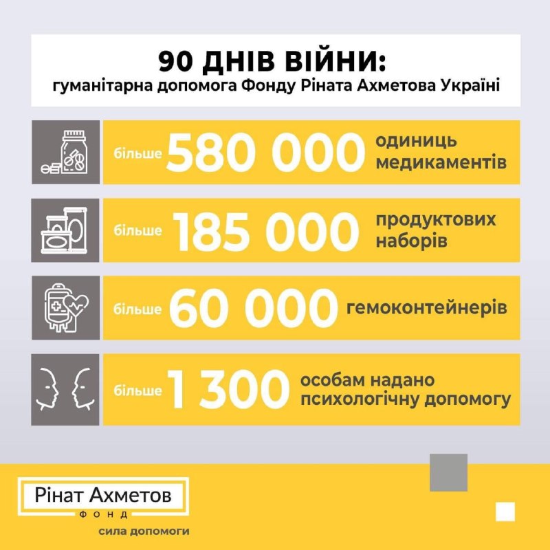 За 90 днів війни Фонд передав для жителів України більше 580 тисяч одиниць медикаментів, понад 60 тисяч гемоконтейнерів і більше 185 тисяч продуктових наборів. Загалом гуманітарна допомога від Фонду охопила більше 1,106 мільйона людей.