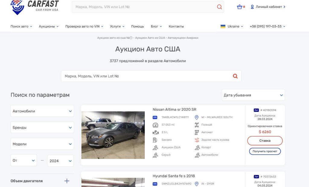 На сайті https://carfast.express/auction зібрані всі американські аукціони авто в одному місці, що дає вам перевагу у виборі, можливість замовити автомобіль, переглянути огляди та відгуки, перевірити авто перед покупкою, відстежувати контейнер з авто, а також прорахувати попередню вартість доставки та ремонту. За запитом ви зможете отримати додаткові фото та відео авто яких немає у вільному доступі.