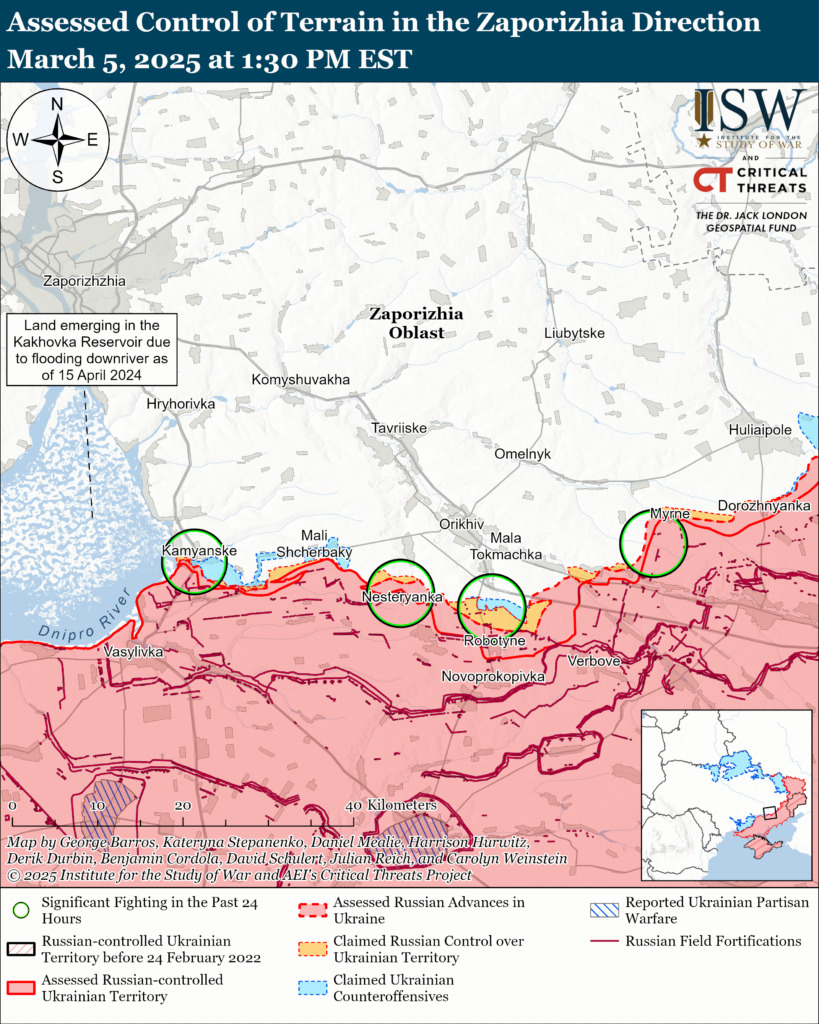 4 і 5 березня війська РФ атакували в районі Новоданилівки, Нестерянки та Кам’янського Запорізької області.