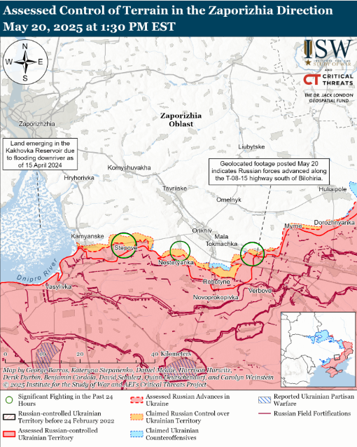 За даними аналітиків, геолокаційні кадри, опубліковані 19 травня, показують, що війська РФ просунулися на південний захід від Білогір’я (на південний схід від Оріхова) у Запорізькій області.