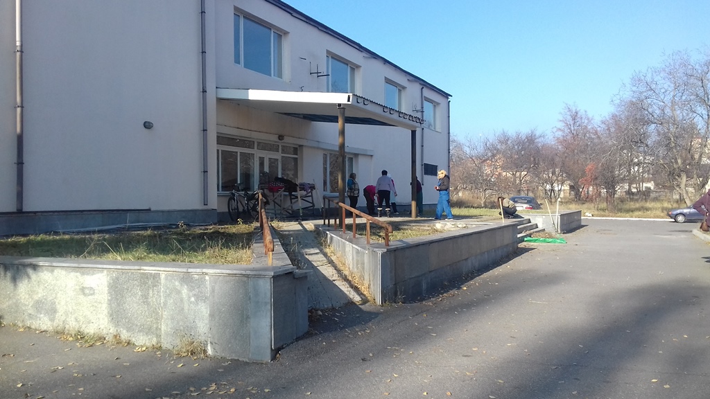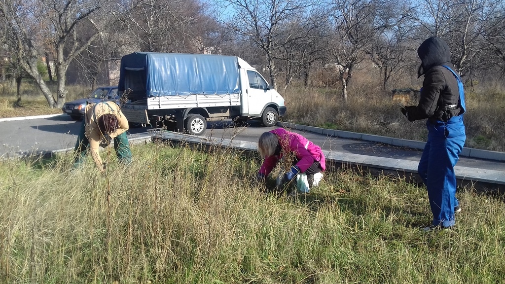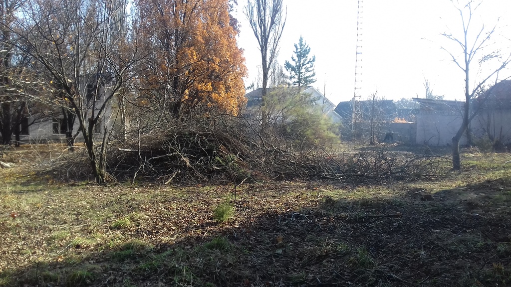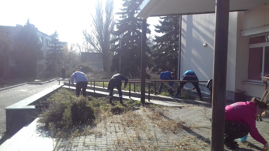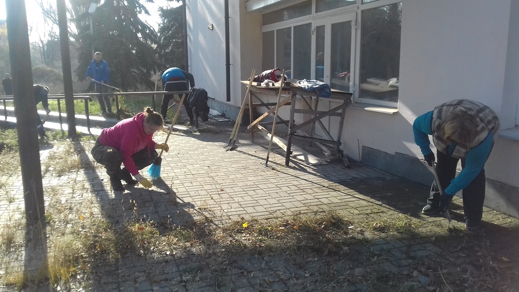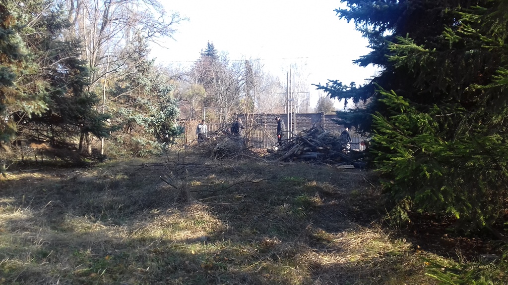 На сегодняшнем субботнике облагораживали территорию возле столовой, вырывали сорняки, убирали листья. Это здание в более пригодном состоянии, чем все остальные. Также убирали заросли деревьев, кустарники. Но работы много и не на один раз.