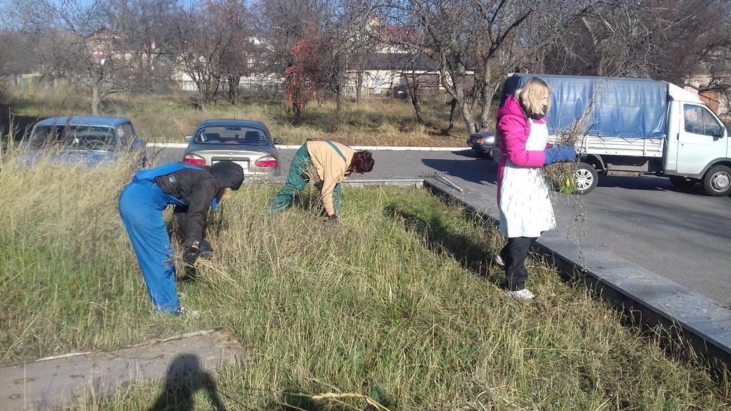 На сегодняшнем субботнике облагораживали территорию возле столовой, вырывали сорняки, убирали листья. Это здание в более пригодном состоянии, чем все остальные. Также убирали заросли деревьев, кустарники. Но работы много и не на один раз.