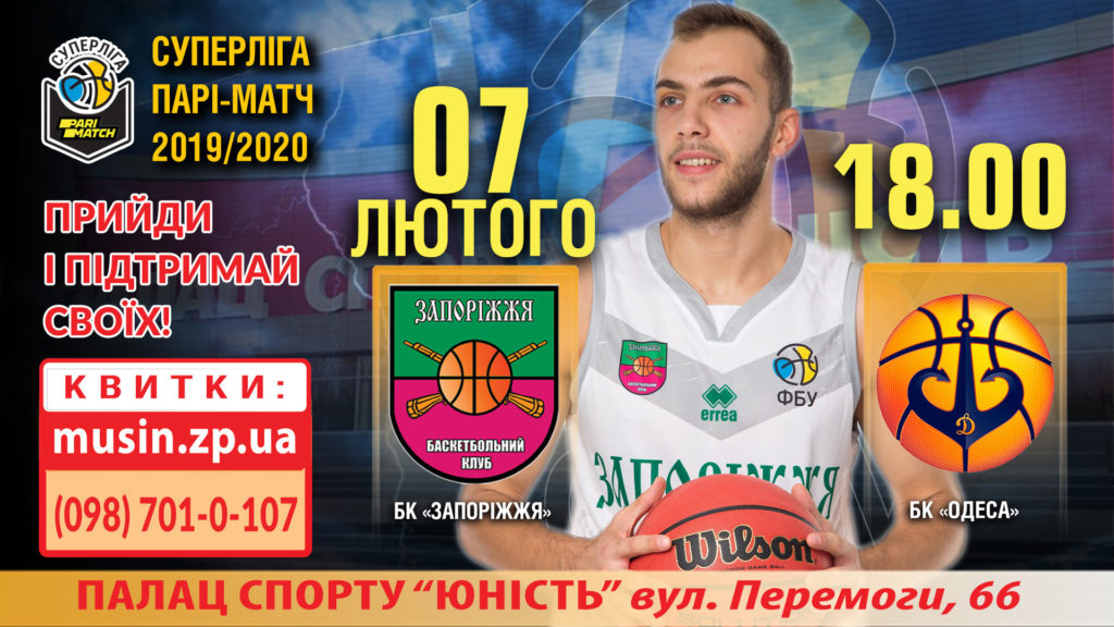 Завтра, 7 лютого, о 18:00 у палаці спорту «Юність» відбудеться баскетбольна гра Суперліга Парі-Матч БК «Запоріжжя» – БК «Одеса».