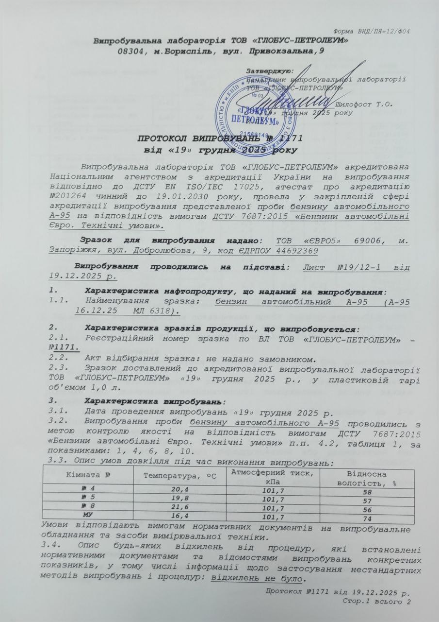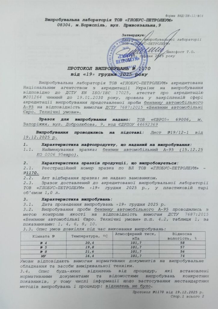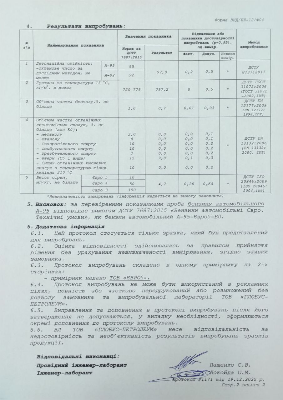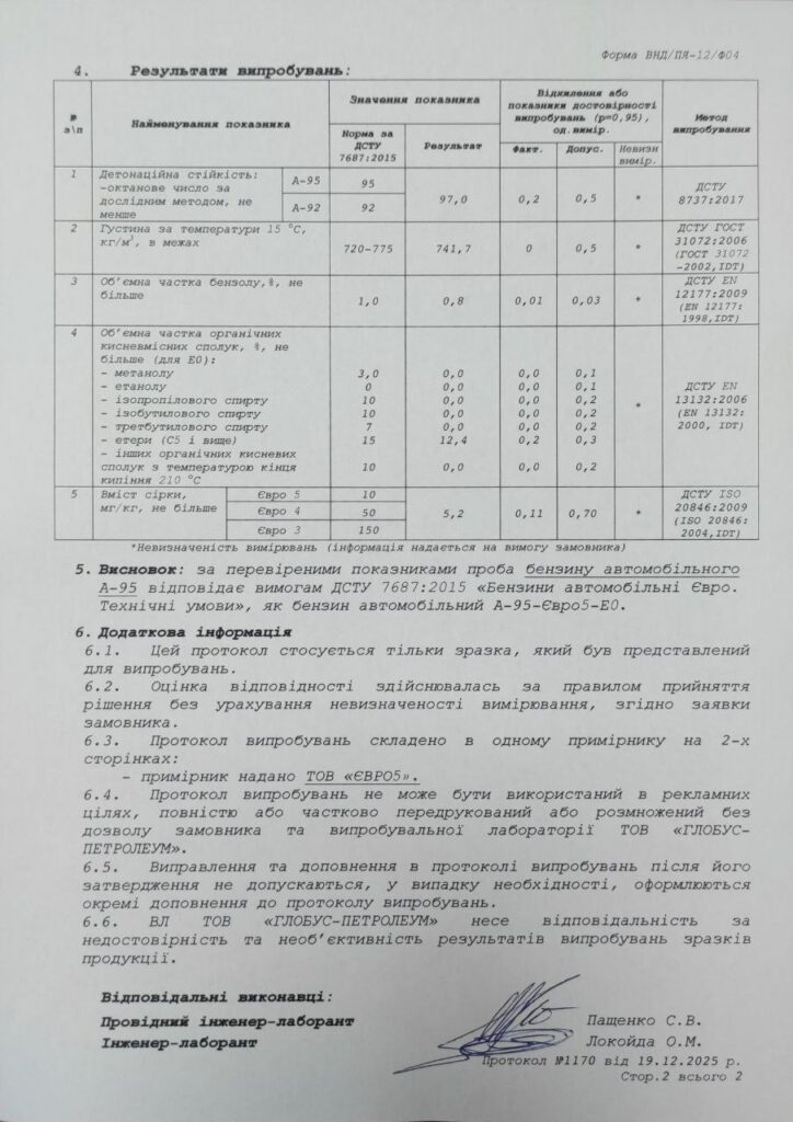 Протоколи від 19 грудня №1170 та 1171 вкотре підтвердили повну відповідність пального технічним вимогам ДСТУ 7687:2015, як бензин автомобільний А95-Євро5-Е0.