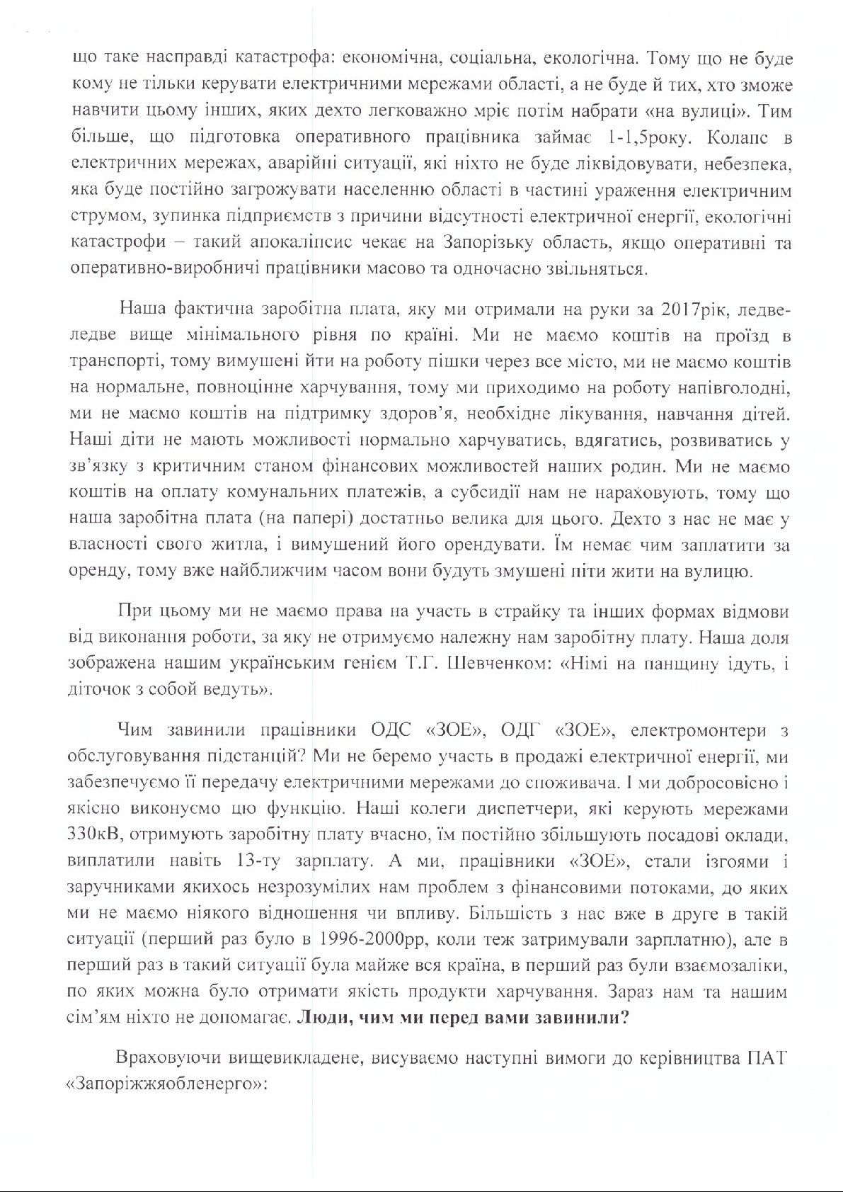 – Мы неоднократно читали или слышали в СМИ фразу: «В «Запорожьеоблэнерго» увольняются лучшие». Нет, на самом деле, лучшие не уволились, они остались, рабоают и за себя, и за того, кто уволился, «держат» на себе электрические сети и их управляемость, и все это без заработной платы. Вот когда у «лучших» лопнет терпение и они примут решение одновременно уволиться, тогда Запорожская область поймет, что такое что такое в действительности катастрофа: экономическая, социальная, экологическая… Коллапс в электрических сетях, аварийные ситуации, которые никто не будет ликвидировать, опасность, которая будет постоянно угрожать населению области в части поражения электрическим током, остановка предприятий по причине отсутствия электроэнергии, экологические катастрофы – такой апокалипсис ждет Запорожскую область, если оперативные и оперативно-производственные работники массово и одновременно уволятся, – говорится в тексте письма, которое сотрудники компании прислали в редакцию 061.