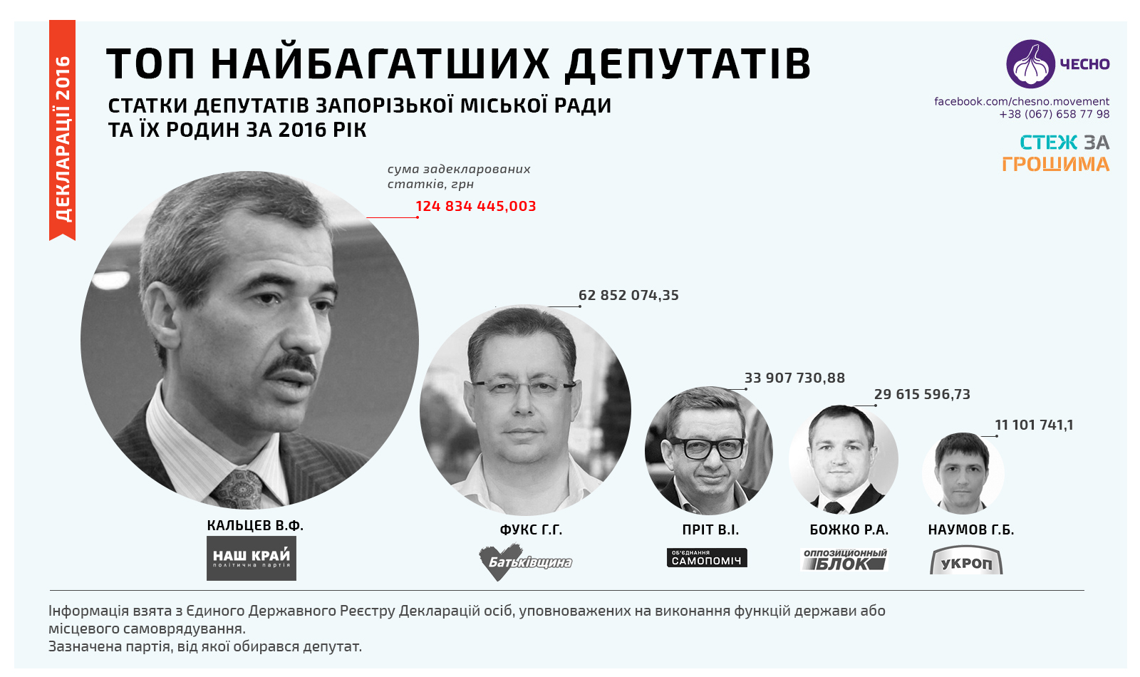 Больше всего денег имеет семья депутата от партии “Наш край” Владимира Кальцева. У него многолетний политический опыт: трижды избирался депутатом, был секретарем Запорожского горсовета, возглавлял городскую организацию “Партии регионов”. Депутат является фактическим владельцем компании “ТД” Александр “, которая занимается горно-металлургическим производством, реализацией горно-шахтного оборудования, абразивного инструмента и материалов.