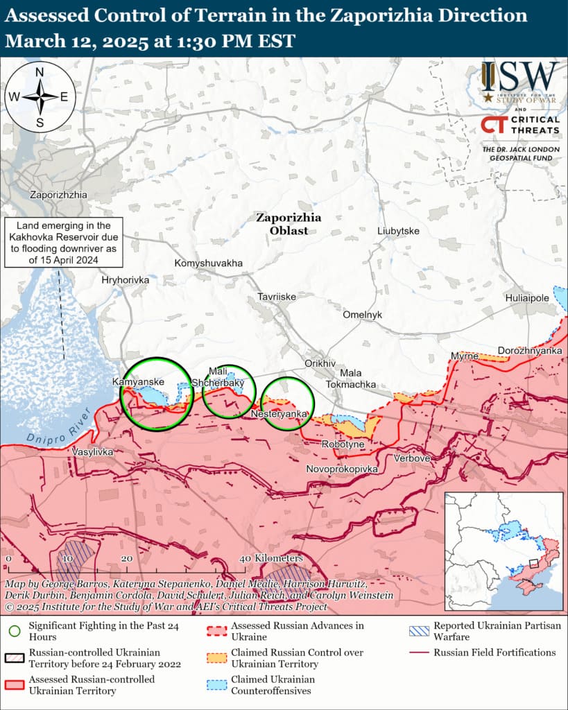 12 березня війська РФ продовжили наземні атаки на заході Запорізької області, але не просунулися.
