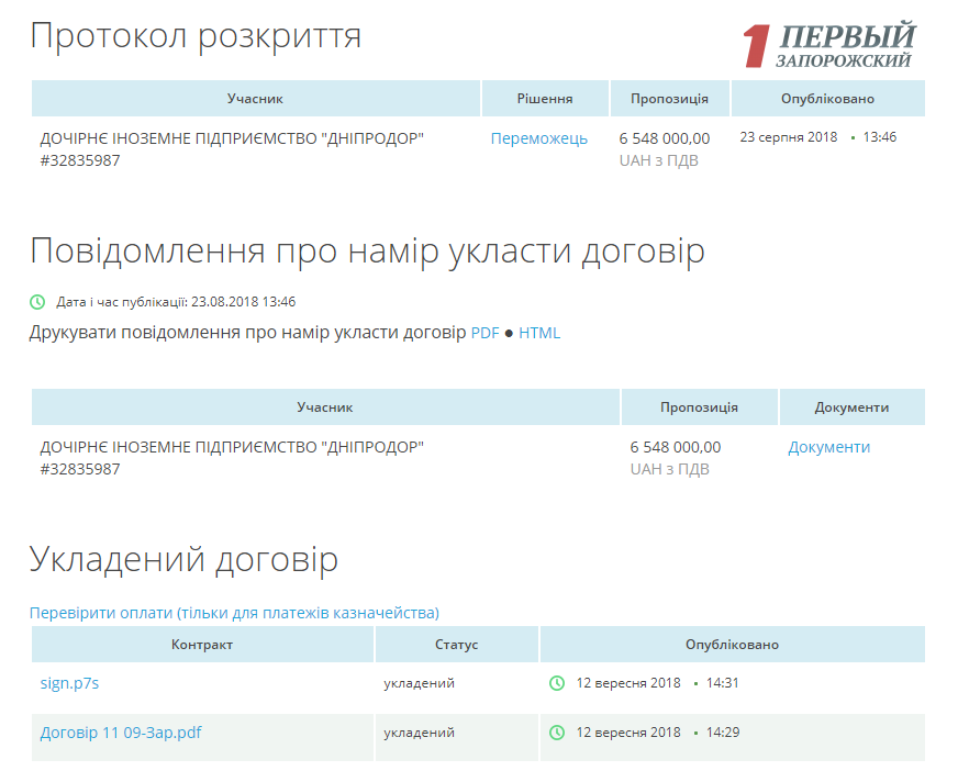 В тендере приняли участие только две фирмы из Днепропетровской области – ООО «Евробуд плюс» и Дочернее инностранное предприятие “Днипродор”. В ходе аукциона самое выгодное предложение предоставил «Днипродор», обошев конкурентов всего на две тысячи.