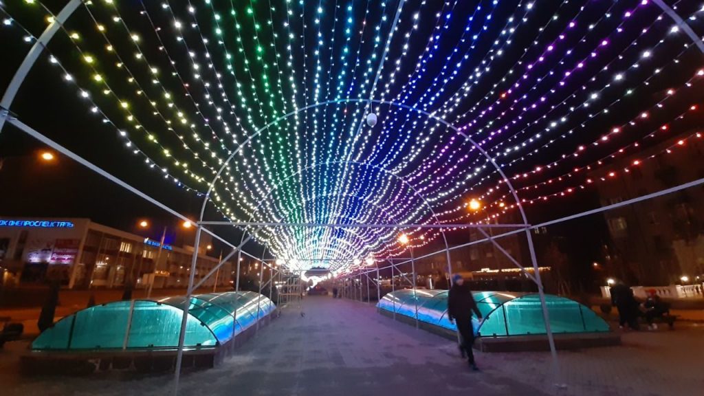 Красиві фото можна зробити на тлі трьох ялинок, сніговика з мультфільму «Холодне серце», а також під двома велики сяючими новорічними вогнями арками.