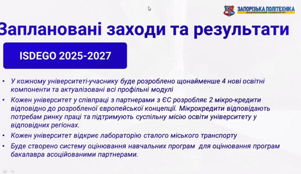 1 січня 2025 року Запорізька політехніка розпочала міжнародний проєкт ISDEGO – «Впровадження цілей сталого розвитку міст у програми підготовки бакалаврів транспортних технологій».