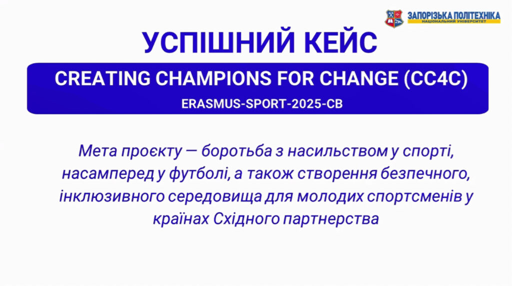 Завдяки злагодженій роботі НУ «Запорізька політехніка» та партнерів із Сербії, Греції й Вірменії перемогу в конкурсі Erasmus-Sport-2025-CB здобув спільний проєкт «CC4C – Creating Champions for Change».