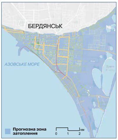 Для порівняння: Гола Пристань ризикує втратити 75% території, Скадовськ — 20%, Одеса — 17%, Херсон — 13%. Бердянськ із показником 30% — серед лідерів антирейтингу міст, яким загрожує затоплення.
