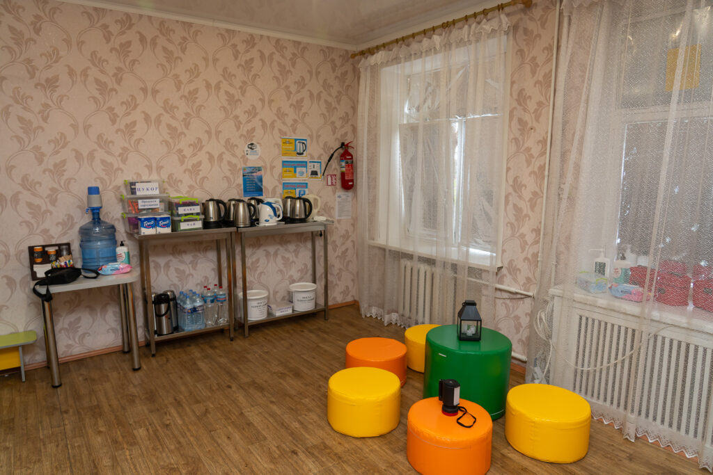 «У нас є кава, чай, печиво, їжа тривалого зберігання. Для приготування напоїв маємо десять електрочайників та чотири термоси, запас одноразового посуду», — зазначила Катерина Сергіївна.