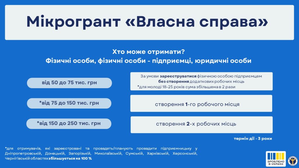 «Власна справа» передбачає надання безповоротних мікрогрантів для започаткування чи розвитку бізнесу. На відміну від кредитів, отримані кошти не потрібно повертати за умови, що підприємець створює робочі місця, справно сплачує податки та єдиний соціальний внесок і провадить діяльність щонайменше протягом трьох років.