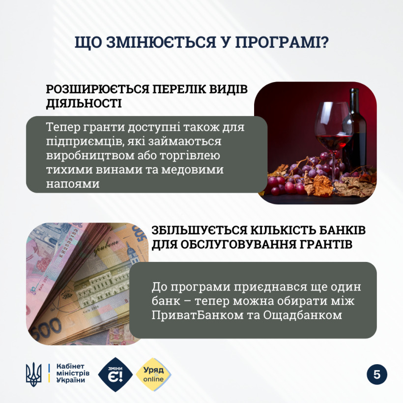 Водночас існують обмеження: гранти не надаються на бізнес у сферах вирощування тютюну, виробництва й продажу алкоголю, страхування життя, оренди нерухомості та транспорту. Проте у 2025 році перелік дозволених напрямів розширили: фінансування стало доступним для підприємців, які займаються виробництвом і торгівлею тихими винами (виноградними та плодово-ягідними), а також медовими напоями.