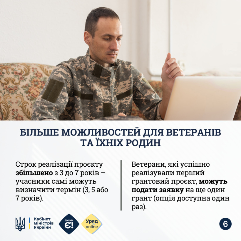 - Для ветеранів та їхніх родин передбачено гранти до 1 млн грн за умов співфінансуванням у форматі 70/30 (держава – 70%, заявник – 30%) та створення чотирьох робочих місць.