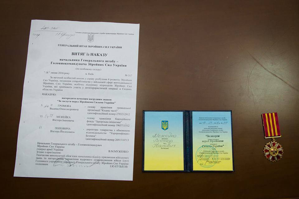 21 июля Виктора Межейко наградили почетным нагрудным знаком за весомый вклад в развитие и всестороннюю поддержку подразделений ВСУ. Бывший глава облсовета получил награду в качестве главы правления благотворительного фонда «Запорожская инициатива», который зарегистрирован на Константина Печерицу и самого Межейко. Событие вызвало широкий резонанс и уже 22 июля советник главы Генштаба сообщила, что приказ о награждении будет отменен, а виновные за «этот досадный инцидент» будут наказаны.