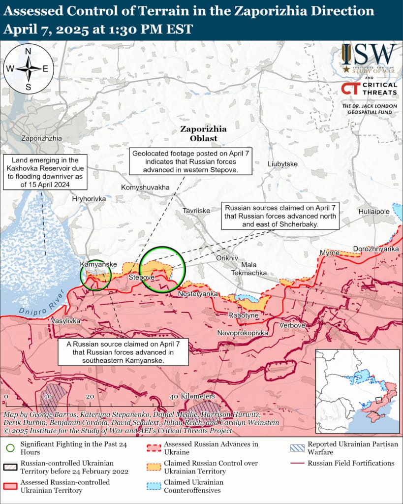 Геолокаційні кадри, опубліковані 7 квітня, вказують на те, що росіяни нещодавно просунулися до західної частини Степового (на північний захід від Роботиного) Запорізької області.