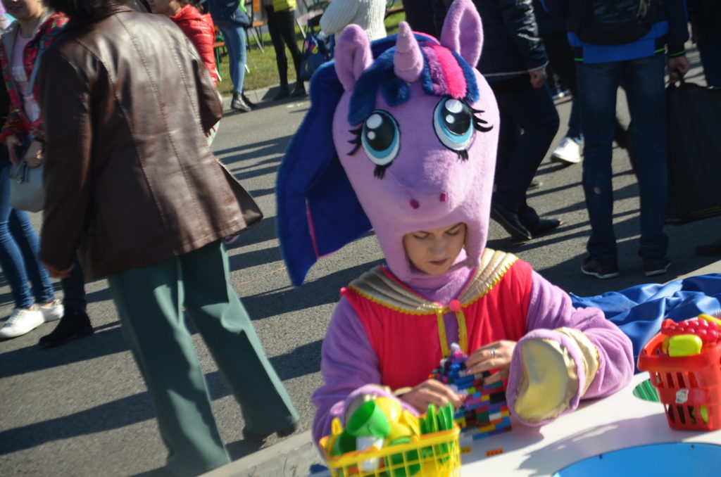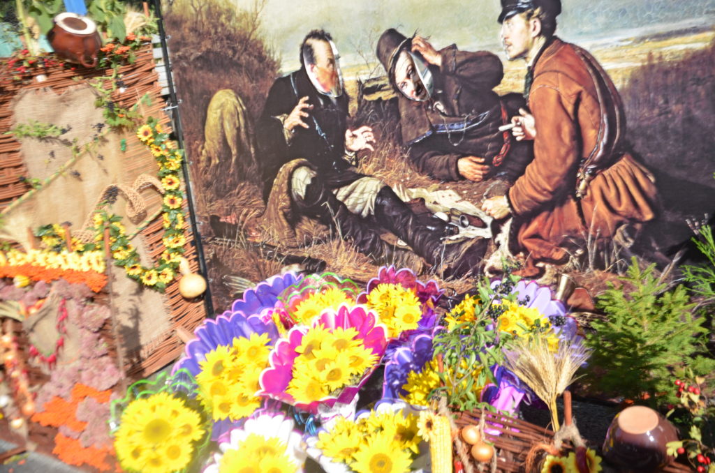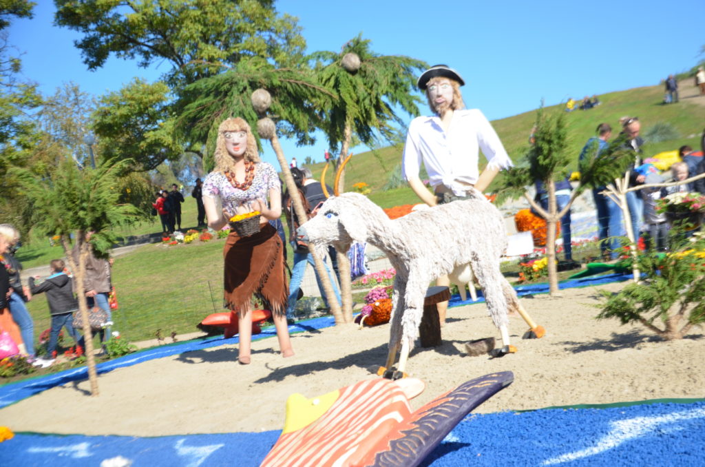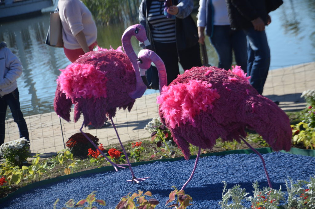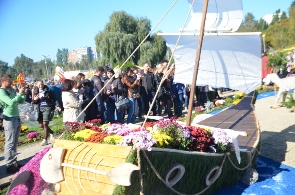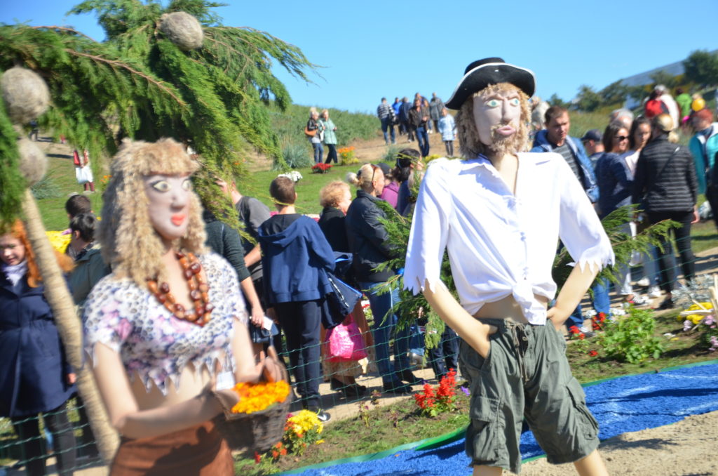 Красочным пятном в этом ярмарочном безумии можно назвать плоды работы сотрудников «Зеленстроя». Цветочные инсталляции в виде сказочных персонажей, пиратов с кораблем, миньонов в костюмах казаков, бабочек, розовых фламинго, музыкальных инструментов и многое другое пришлось по душе не только детям, но и взрослым. Всего мы насчитали восемнадцать композиций для изготовления которых использовали около 20 различных растений и 18 тысяч цветов. Запорожцы оккупировали эту территорию и несмотря на надписи, запрещающие ходить по газонам, всё равно бежали, чтобы сфотографироваться с полюбившимися героями.