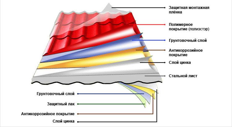 Тонколистова сталь після низки виробничих етапів перетворюється на металочерепицю – привабливий та витривалий покрівельний матеріал. Структура аркуша передбачає наявність: