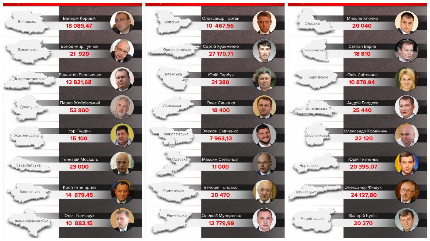 Самым богатым губернатором оказался, руководитель Донецкой ОГА Павел Жебривский. Он заработал 53,8 тысяч гривен.Также тройку лидеров возглавили глава Луганской военно-гражданской администрации Юрий Гарбуз. Его доход — 31 380 гривен. И Кировоградской ОГА Сергей Кузьменко, доход которого составил 27 170,71 грн.