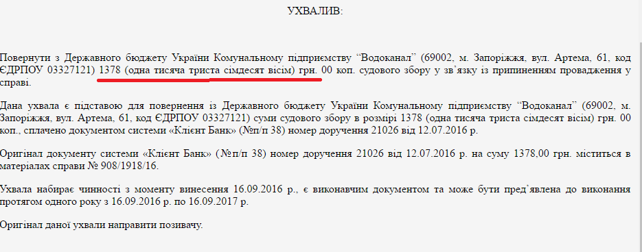 В то же время “Водоканал” потребовал в судебном порядке компенсировать ему средства оплаченные за судебный спор. Речь идет о сумме в три раза превышающую предмет спора – 1378 гривен. Суд постановил вернуть из госбюджета Украины средства «Водоканалу» в следствие прекращения производства по делу.