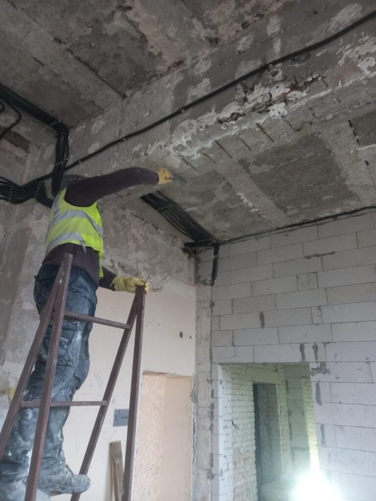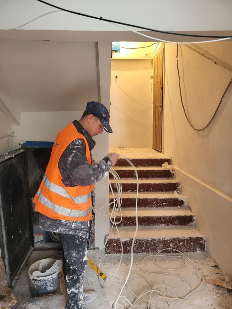 У Запоріжжі продовжується відновлення чотирьох, частково зруйнованих російськими снарядами, багатоповерхових будинків. Так, у будинку по вулиці Сталеварів, 16 підрядник зараз проводить монтаж інженерних та електричних мереж у відновленому під’їзді.