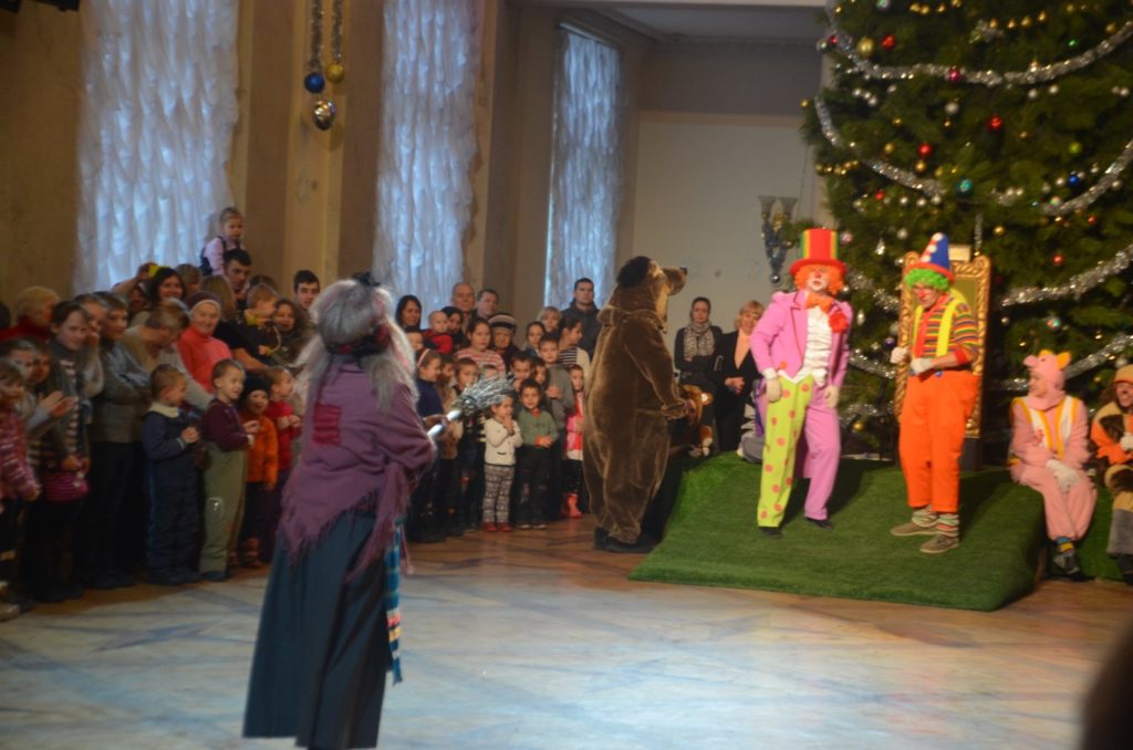 Гостей театра ждала интермедия возле новогодней елки с Дедом Морозом, Снегурочкой и другими сказочными героями. После различных конкурсов, викторин и хороводов, детишкам показали спектакль «Пеппи Длинныйчулок. Тайна счастливого детства».