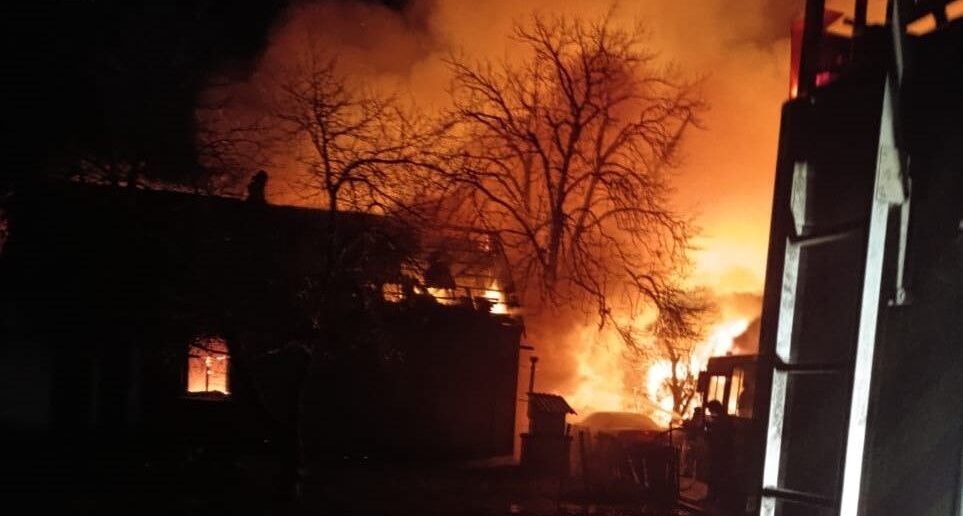 В результаті ударів сталися пожежі за п’ятьма адресами. Горіли чотири житлові будинки та господарчі споруди.