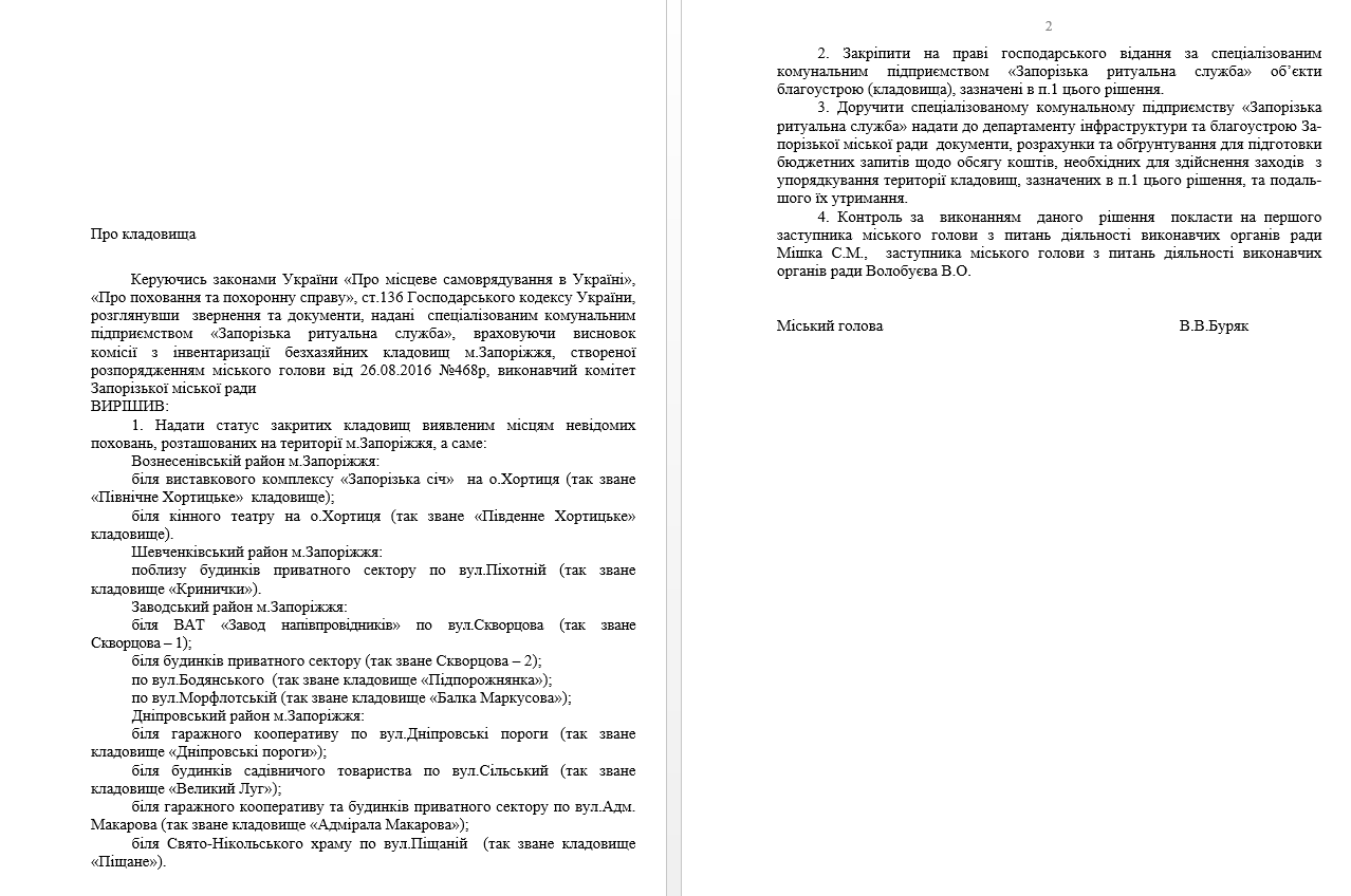 Такое решение принял Запорожский городской исполнительный комитет после проведения инвентаризации бесхозных кладбищ.