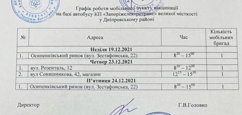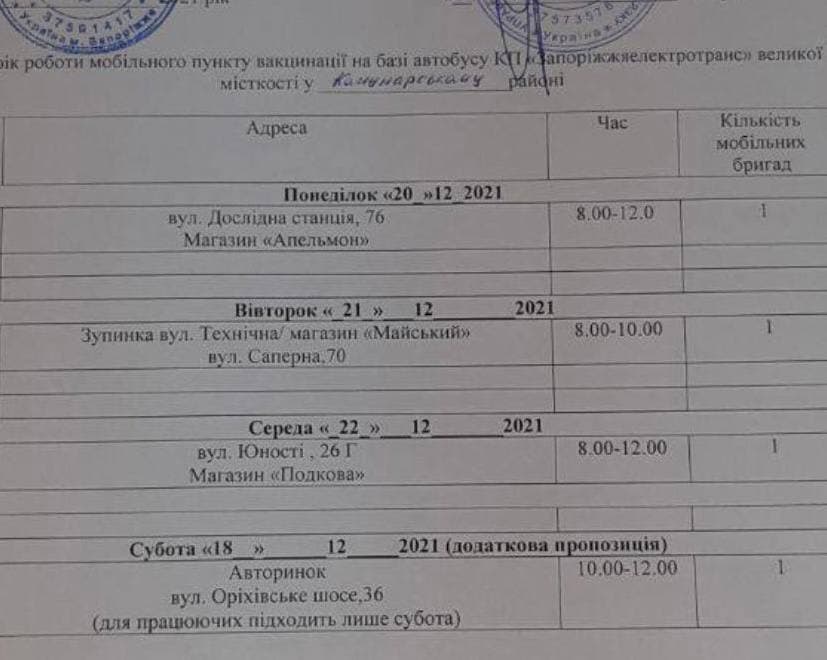 За інформацією секретаря міської ради Анатолія Куртєва, цими вихідними та наступного тижня запорізький «вакцинобус» працюватиме у двох районах міста: