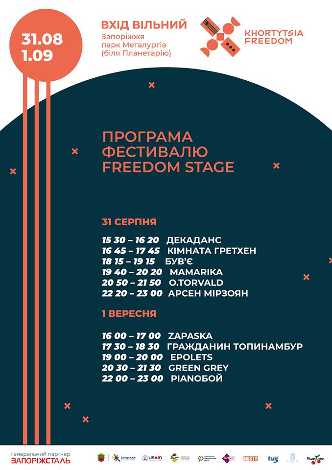 Вже сьогодні, в суботу, в парку ім. Сацького біля планетарію в Запоріжжі вже вдруге пройде фестиваль Khortytsia Freedom. Два дні, три сцени, 35 колективів і тисячі слухачів – останні вихідні літа стануть дуже насиченими. «Перший Запорізький» зібрав всю інформацію про цей музичний фестиваль.