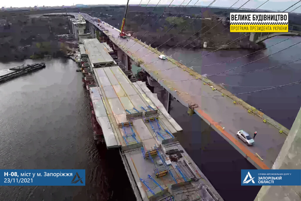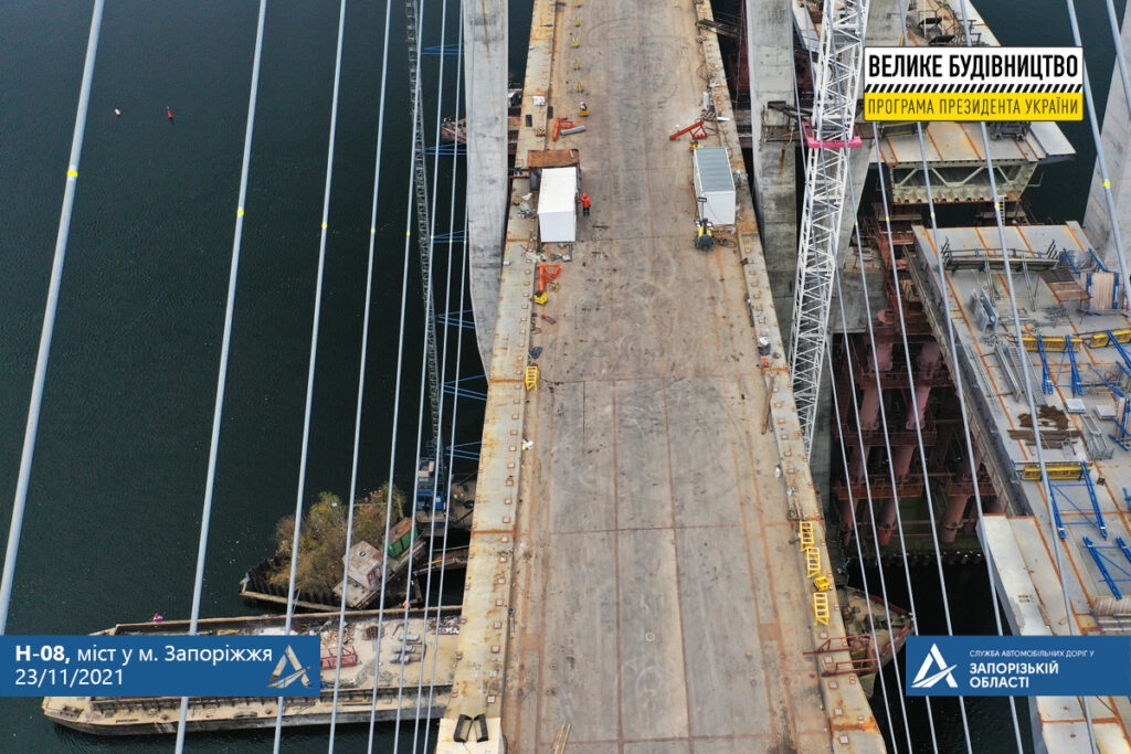 На будівництві запорізьких мостів зараз активно працює понад 600 мостобудівників на 14 спорудах, одній транспортній розв’язці, на будівельному майданчику поблизу Кривої бухти та на об’єкті будівництва комплексу воєнізованої охорони залізничного мосту.
