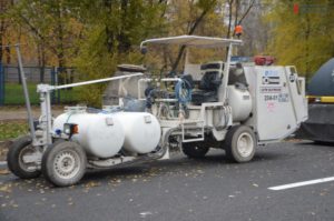 На даний момент на об’єкті працюють два десятка робітників. Сьогодні ведуться останні роботи з укладання другого шару асфальту на правій стороні магістралі. Потім четверо фахівців, які входять в структуру центрального офісу «Онура» на Україні, розташованого у Львові, будуть займатися нанесенням дорожньої розмітки на спеціальному агрегаті. Виглядає він таким чином.