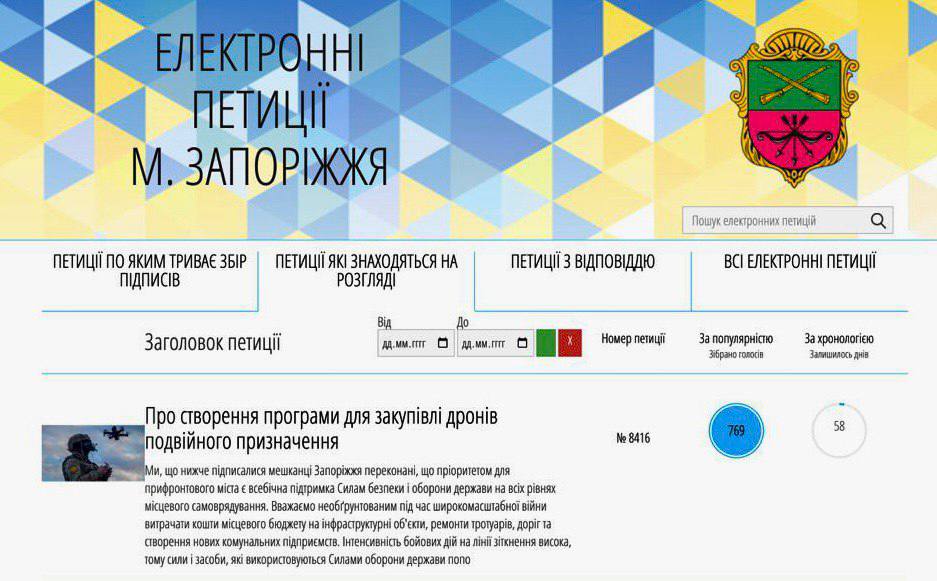 Петиція запорізького військовослужбовця Збройних сил України Іван Мінченко за добу набрала необхідну кількість підписів. Сотні людей підтримали ідею про створення міської програми для закупівлі дронів подвійного призначення. Найближчим часом її розглянуть на сесії Запорізької міської ради.
