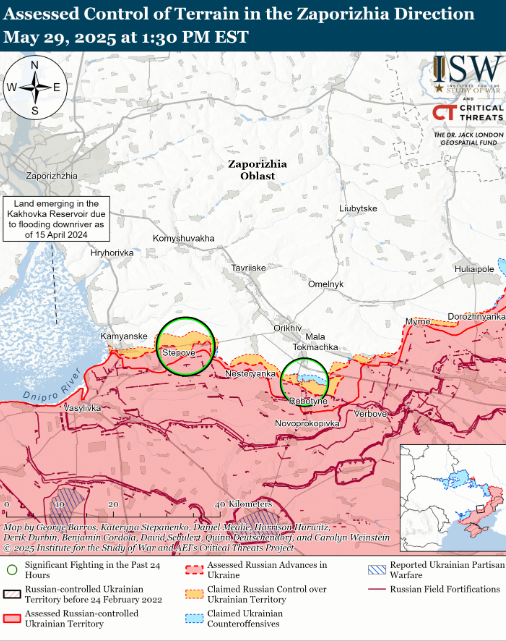 Російські війська продовжували наступальні операції на заході Запорізької області 29 травня, але не досягли жодних підтверджених просувань.