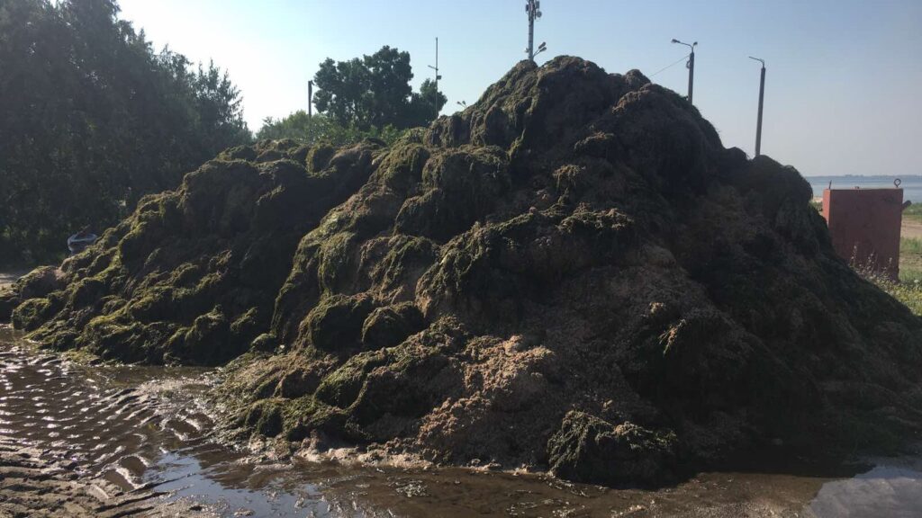 У курортному Бердянську змінився напрямок вітру. Внаслідок цього до берега прибило тонни зелених водоростей, що замінили медуз.