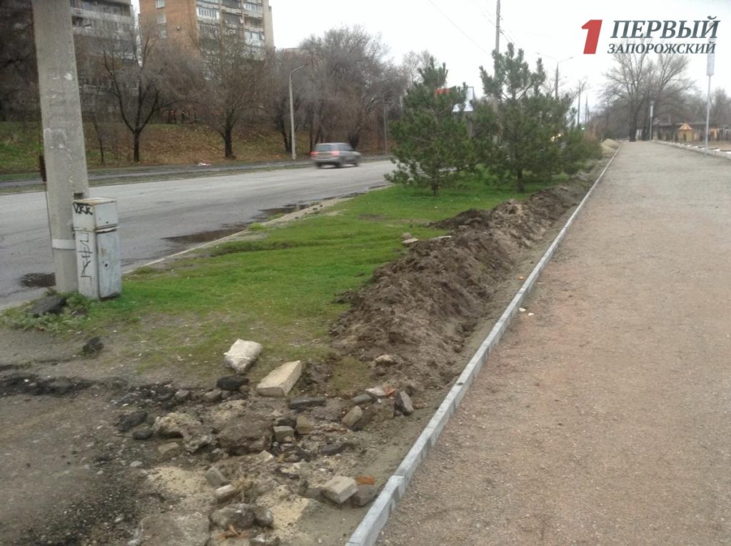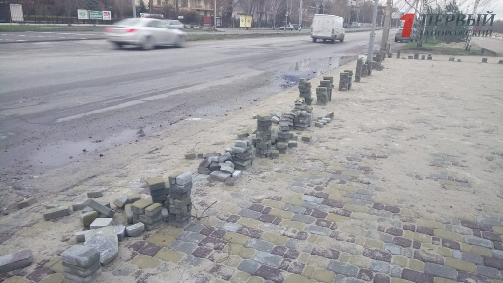 К слову, более половины участка до кафе Санрайз осталось в песке и без плитки. То ли стройматериалы закончились, то ли из-за неблагоприятной работы, но подрядчики решили приостановить реконструкцию на неопределенный срок. Непонятно одно: зачем понадобилось срочно снимать такую же цветную плитку, которую поставил еще полтора года назад один запорожский бизнесмен и оставить эту территорию незаконченной. Прохожие здесь просто растаптывают мелкий щебень и песок.
